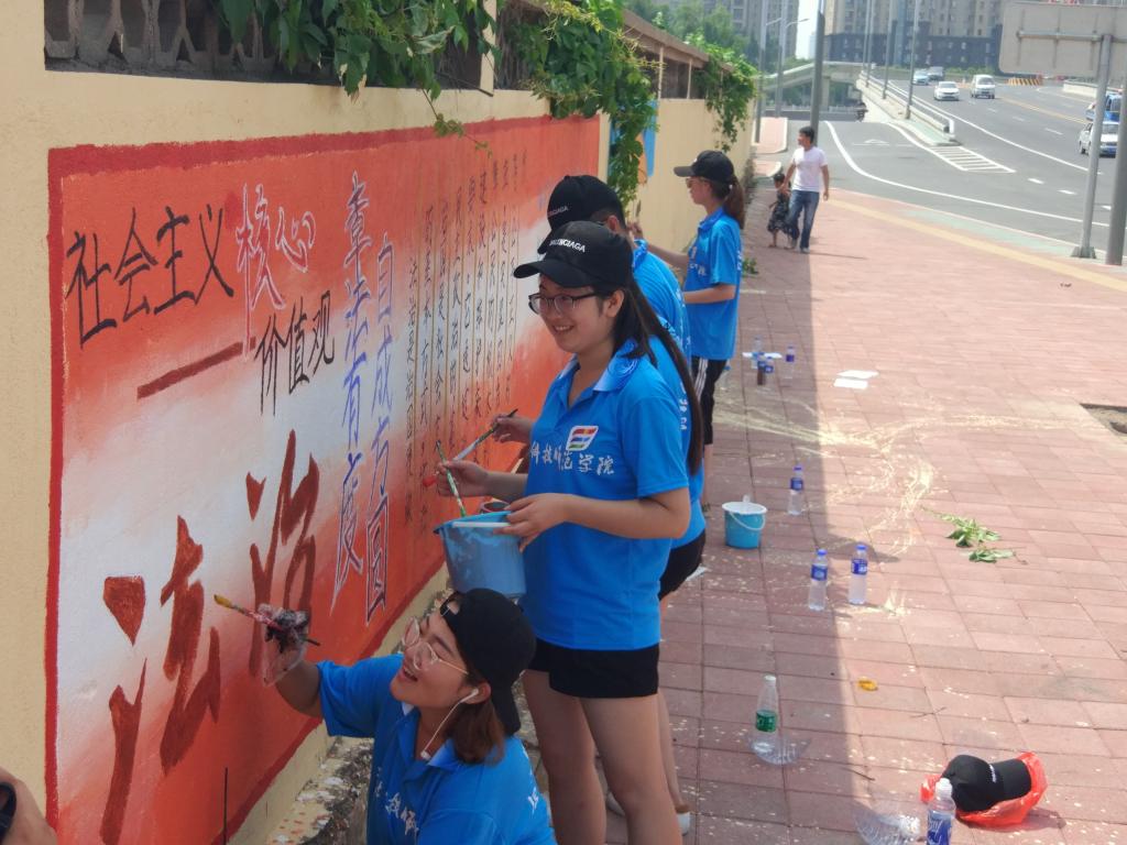 7月16日,队员们来到在水一方社区,绘制法制文化宣传墙。此次宣传墙共分为“纪念12·4宪法日”、“法制社区创建标准”、“未成年人普法漫画”等20余个板块,内容涵盖《宪法》、《民法》、《未成年人保护法》等十几种法律法规。队员们对墙面进行合理规划与布局,细致量尺,精心绘画,历时一天半,完成了总面积约900平方米的法制宣传墙面的绘制,得到社区服务中心工作人员的认可,也吸引了周边大量居民前来观看学习。