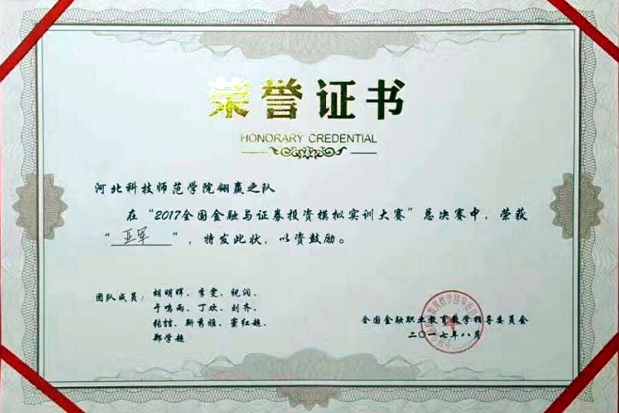 近日,全国证券投资模拟实训大赛总决赛在深圳落下帷幕。由我校财经学院学子组成的“河北科技师范学院翎赢之队”获得亚军,指导教师宋英利、王亦明获得“优秀指导教师”称号。