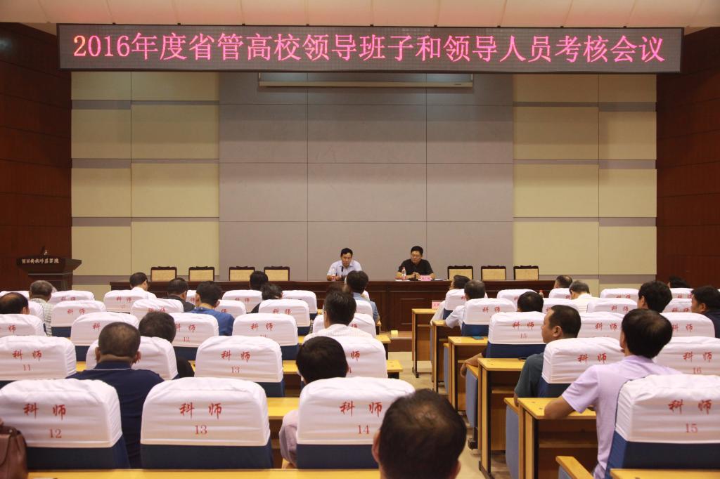 2017年9月6日,我校在秦皇岛校区召开了2016年度省管高校领导班子和领导人员考核会议。省属高校第二考核组组长吴广超和考核组成员周法军、李杰、朱国勇、王凤飞、袁亚兵、李轶等出席了会议。学校领导班子成员,退出领导岗位但未办理退休手续的省管干部,中层正、副职干部,教职工代表以及学生代表参加了会议。会议由校党委书记靳占忠主持。