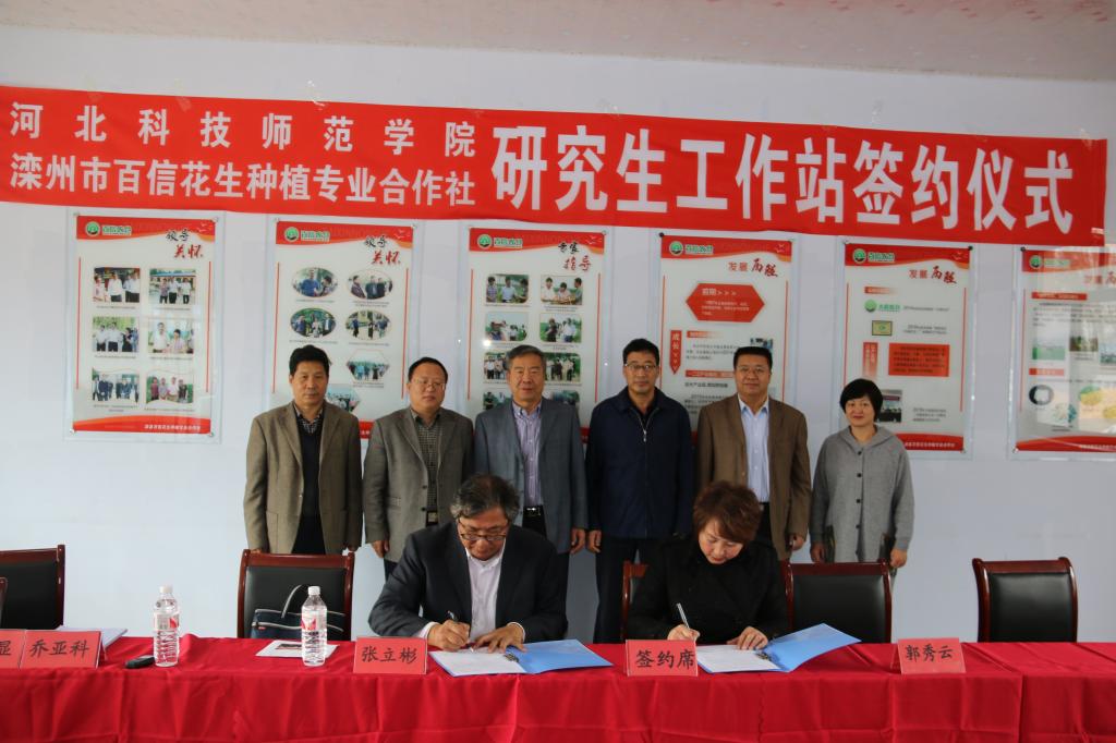 2018年10月16日,我校研究生部、财经学院、农学与生物科技学院相关领导一行6人赶赴滦州市,与滦州市市委组织部、滦州市农牧局、滦州市百信花生种植专业合作社洽谈合作事宜,与滦州市百信花生种植专业合作社签署了研究生工作站协议并举行了授牌仪式。
