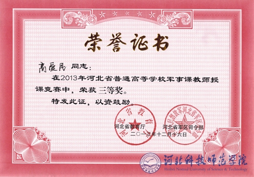 2013年12月14日至17日,河北省第三届普通高等学校军事理论课教师授课竞赛在石家庄举行。我校教师高爱民荣获三等奖。这是我校军事理论课教师首次在此项比赛中获奖。(编辑:孙艳敏 审稿:赵建平)