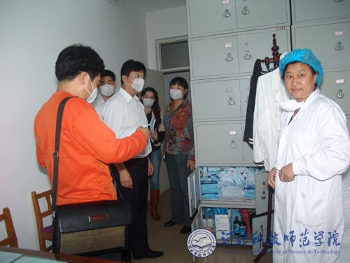 图为市卫生局疾控中心领导在检查我校开发区校区医院防控物资储备情况
