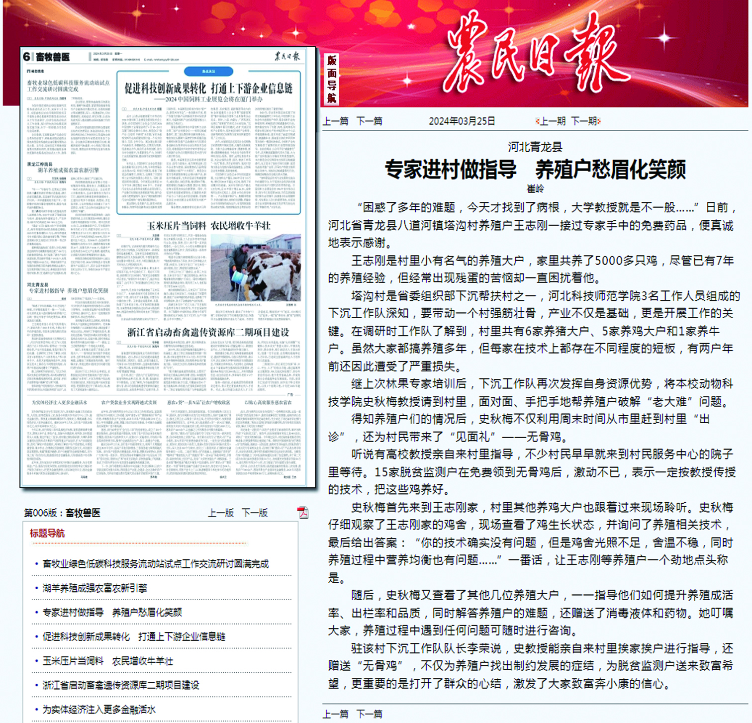 2024年3月25日,《农民日报》第六版《畜牧兽医》栏目,以“河北青龙县专家进村做指导 养殖户愁眉化笑颜”为题,对河北科技师范学院动物科技学院史秋梅教授走进我校河北省驻青龙县八道河镇塔沟村工作队的村养殖户进行养殖技术指导进行了宣传报道。中国农网均进行了报道。