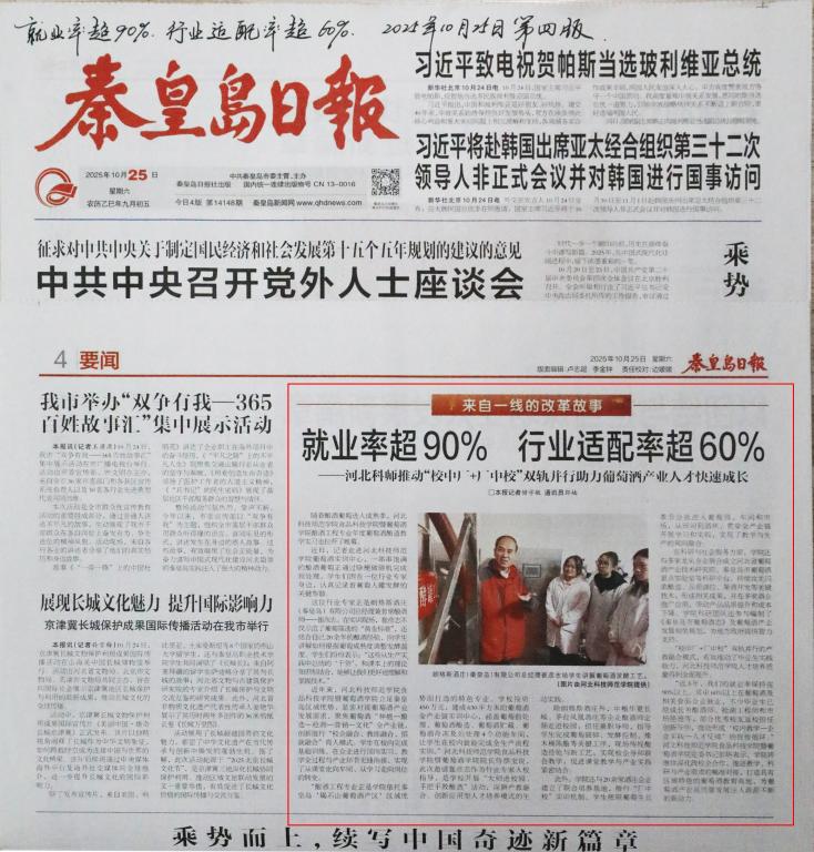 2025年10月25日,《秦皇岛日报》第四版以“就业率超90%,行业适配率超60%——河北科师推进'校中厂+厂中校'双轨并行助力葡萄酒产业人才快速成长”为题,对河北科技师范学院食品科技学院暨葡萄酒学院邀请经验丰富的行业专家朗格斯酒庄总经理、葡萄酒行业著名酿酒大师崔彦志先生走进校园,指导酿酒工程专业年度葡萄酒酿造教学实习并助力葡萄酒产业人才快速成长情况进行了宣传报道。