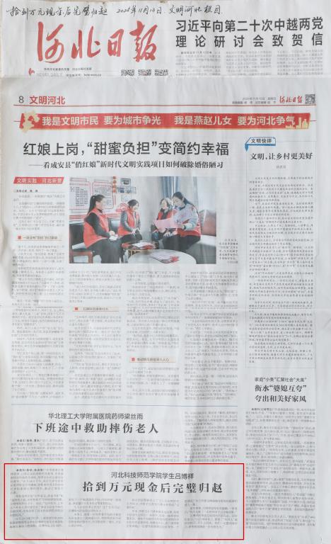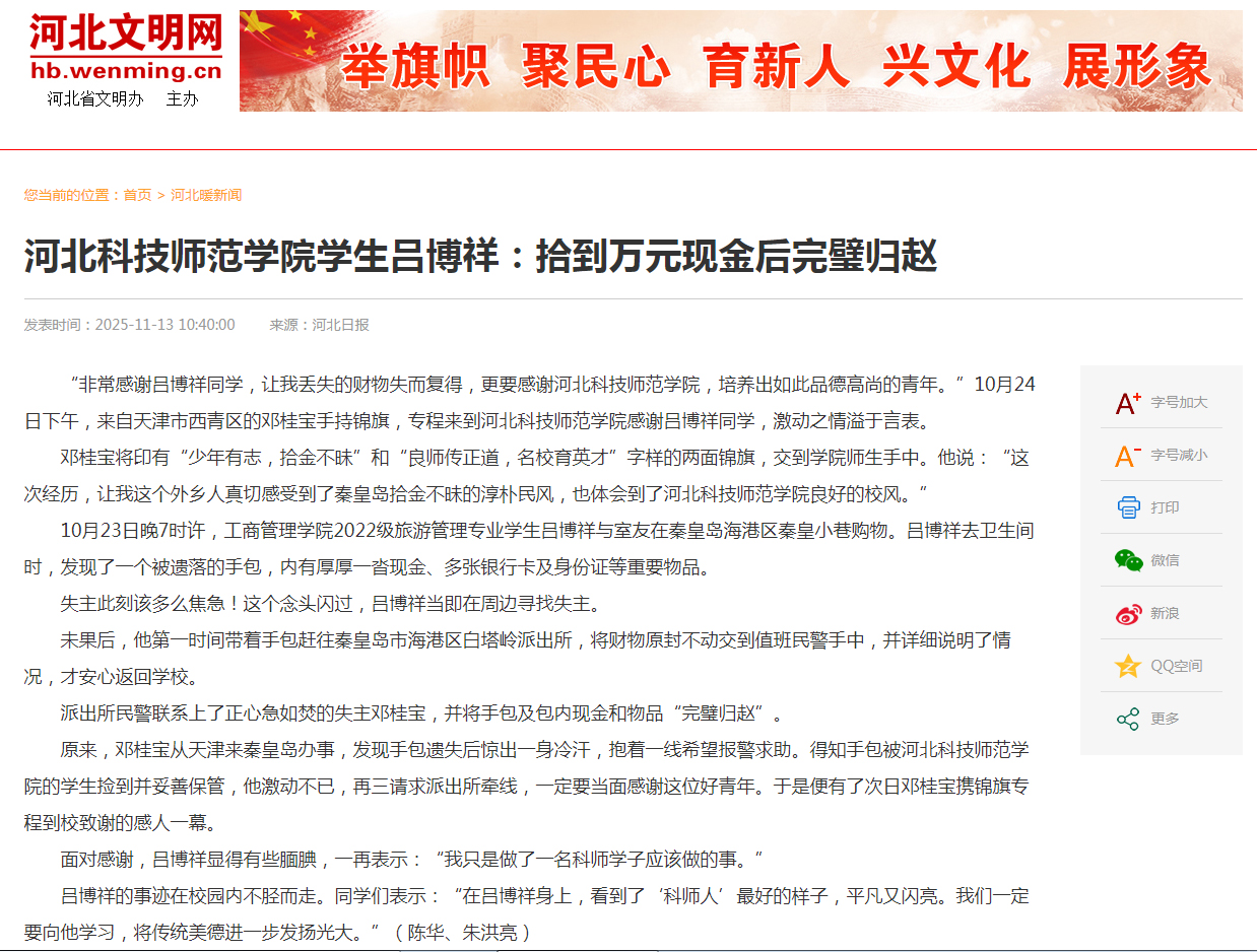 2025年11月13日,《河北日报》第八版文明河北栏目、河北新闻网、长城网.冀云、河北文明网、河北省高校网络思想政治工作中心网、新浪财经网等国内媒体对河北科技师范学院工商管理学院吕博祥同学拾金不昧事迹进行了广泛宣传报道。