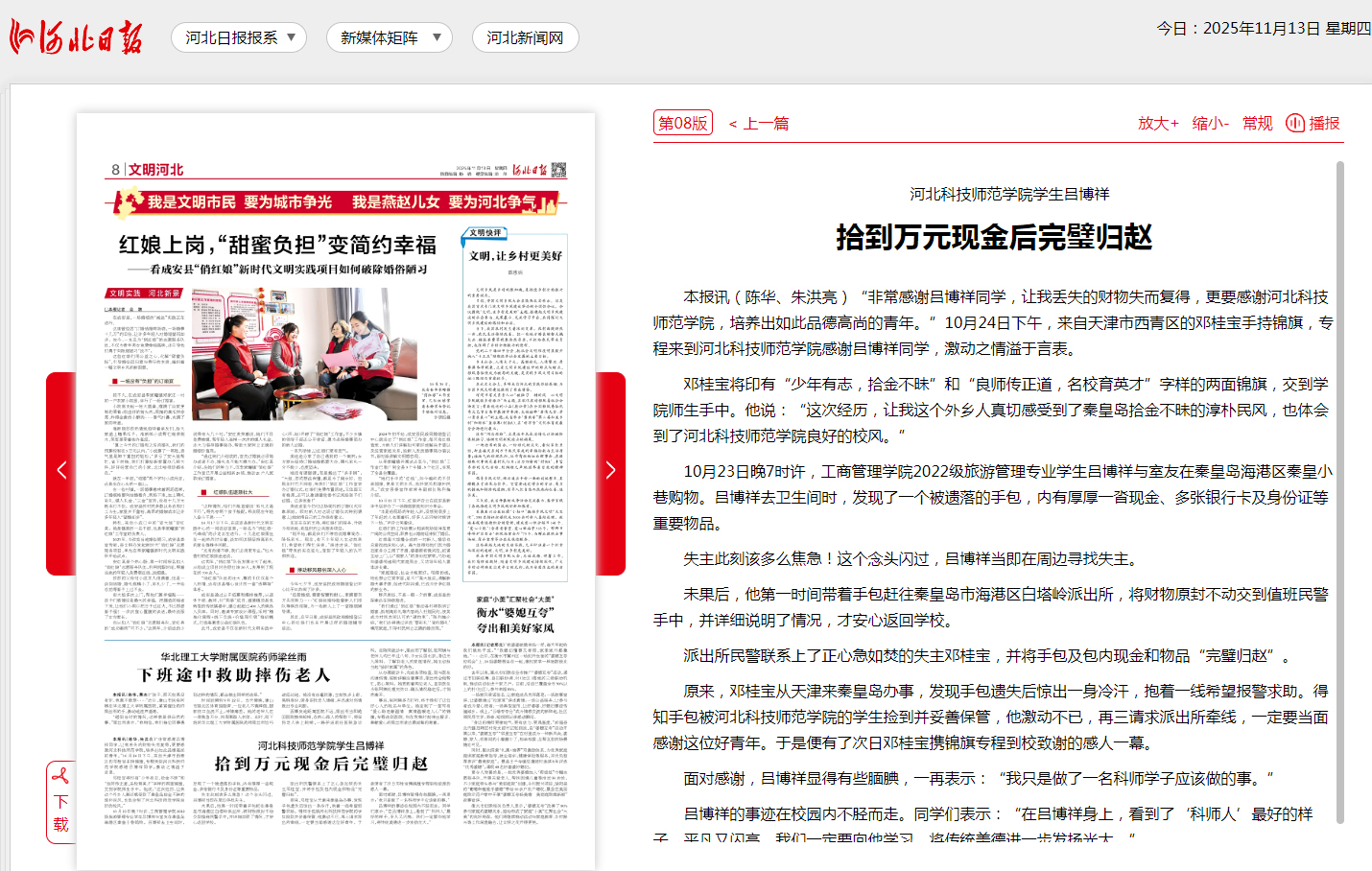 河北文明网2025年11月13日第八版文明河北栏目宣传报道