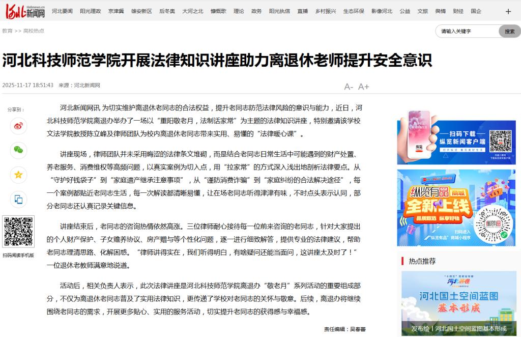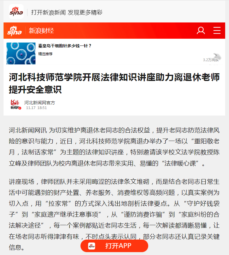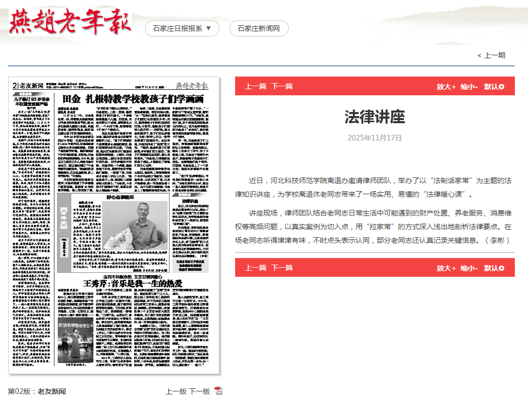 2025年11月17日,《燕赵老年报》以“法律讲座”为题,对我校离退休党总支积极组织开展法律知识讲座活动进行了宣传报道。同时,河北新闻网、新浪财经网、东方资讯网等媒体均予以广泛宣传报道。