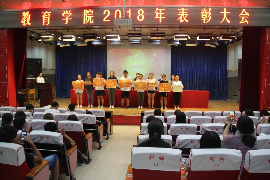 大会在嘹亮的国歌中拉开序幕。会上宣读了《教育学院2017—2018学年度表彰决定》《优秀学生奖学金名单》《先进班集体、三好学生、优秀学生干部名单》《五四红旗团支部、一团一品特色团支部、优秀青年志愿者协会、优秀团员、优秀团干部、优秀青年志愿者、社会实践先进个人、十佳青年名单》。与会领导老师为受到表彰的集体和个人代表颁奖。十佳青年毛佩佩、优秀团员段浩腾作为获奖代表发言。