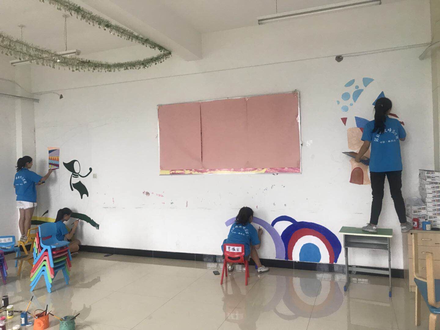 此外,队员们还充分利用孩子们休息时间,进行环创,在教室墙面、楼道里做了各种美术设计,并吸引孩子们积极参与,为孩子们营造一个更温馨的学习生活环境。