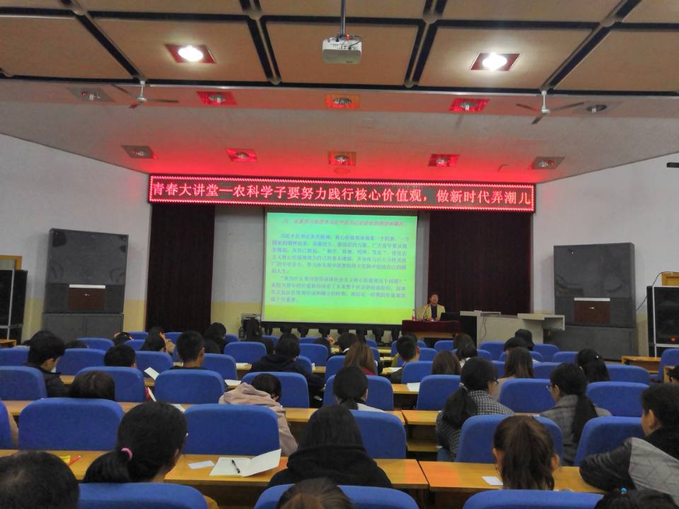 2018年10月22日晚,农学与生物科技学院举办了《农科学子要努力践行核心价值观,做新时代弄潮儿》的青春大讲堂专题讲座,学院党委负责人作了专题报告。 150名青年学生参加了活动。