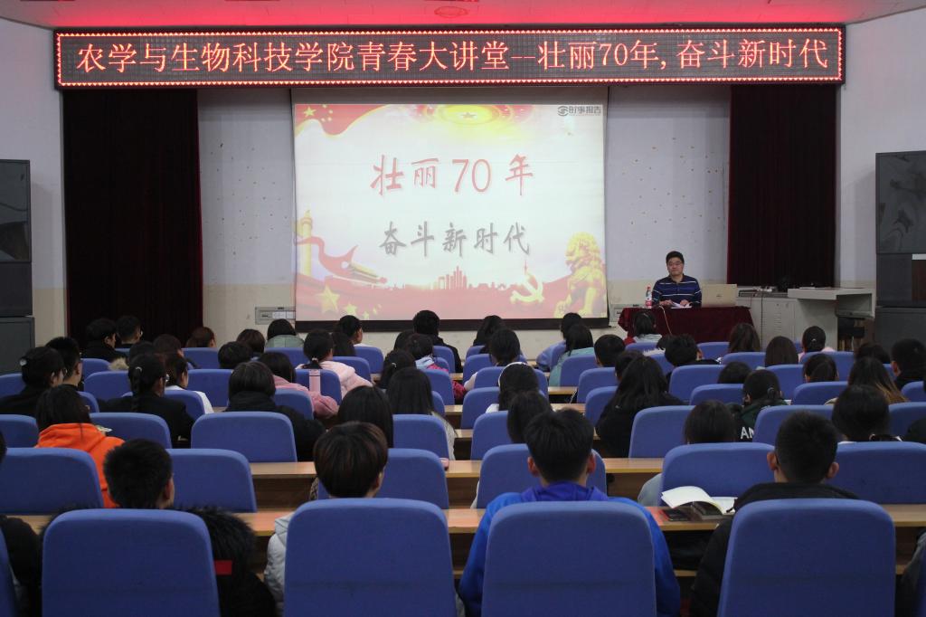 2019年11月14日晚,农学与生物科技学院紧密结合当前学校开展的“不忘初心、牢记使命”主题教育,在“青春大讲堂”上举办了以学习宣讲《习近平总书记在“不忘初心、牢记使命”主题教育工作会议上的讲话》精神和以阐释新中国成立70周年走过的光辉历程、取得的辉煌成就以及宝贵经验启示----《壮丽70年,奋斗新时代》为主题主线的讲座。学院党委负责人为200名青年学生进行了深入浅出的讲解。