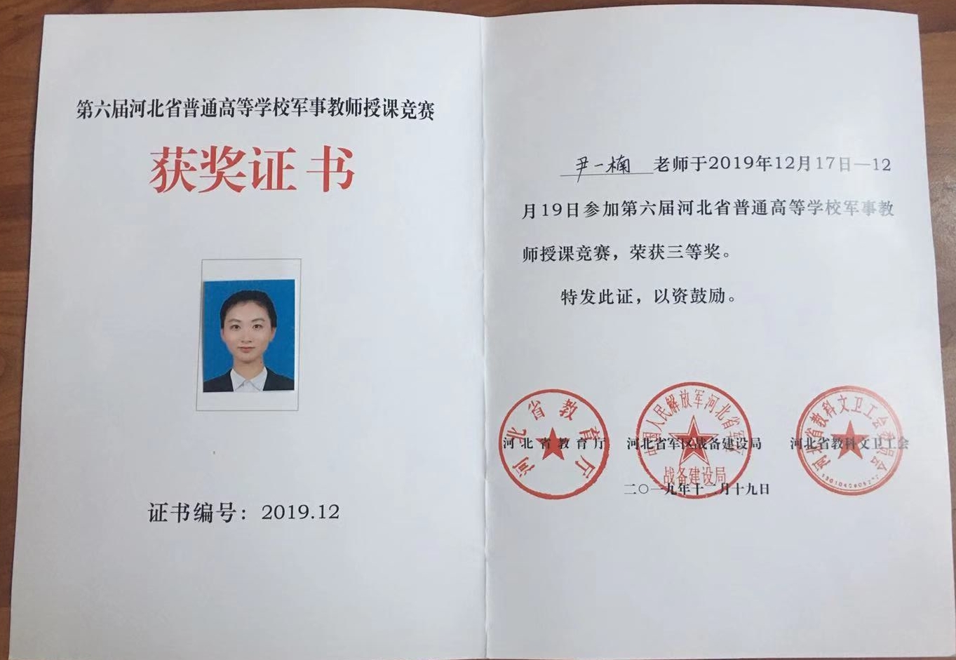 2019年12月16日至19日,河北省第六届全省高等学校军事教师授课竞赛在省军区训练基地举办,来自全省74所高校的98名军事理论教师参赛,我校军事理论教师尹一楠荣获三等奖。