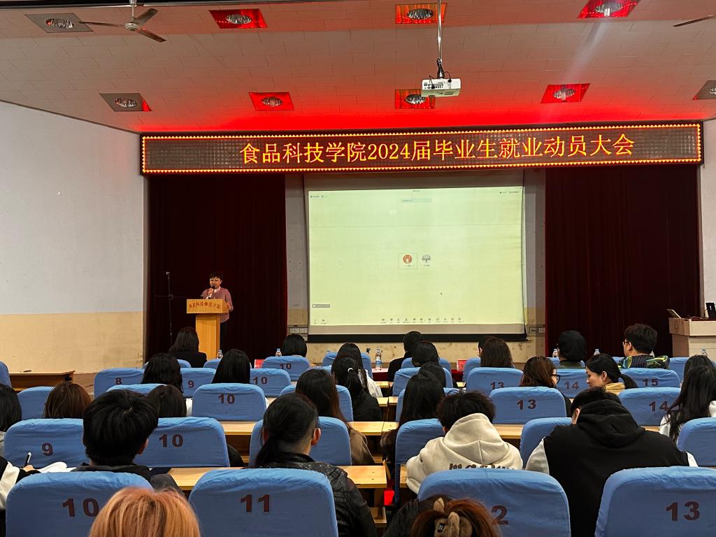 2024年4月9日,食品科技学院召开2024届毕业生就业动员大会。学院领导、毕业班班主任、教学部主任、2007届优秀校友黄晗、2024届毕业生以及2021级部分同学参加了就业动员会。