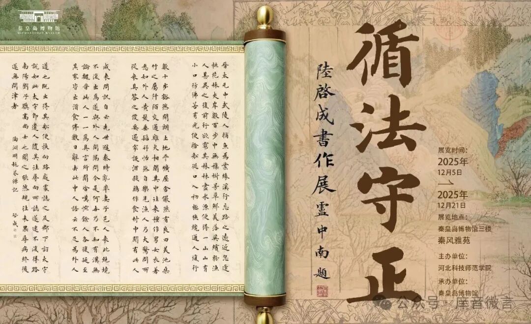 2025年12月5日,由河北科技师范学院主办的“循法守正——陆启成书作展”在秦皇岛博物馆展出。本次展览作品56件,册页与手卷10件。本次展览的主题——循法守正,是当今楷书一代宗师卢中南先生为展览所题,表达出对自己得意弟子陆启成书法成就的充分肯定与褒奖。从卢中南、徐建融等书法名家的题赠赞誉,到陆启成匠心独运的创作,每一幅作品都承载着对传统的敬畏与传承。