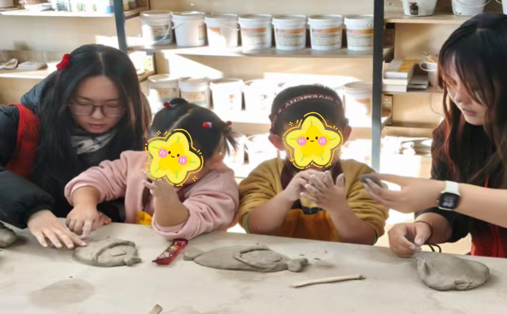 制作过程中,活动室里充满了欢声笑语。孩子们不时举起自己的作品向同伴和志愿者展示,脸上洋溢着自豪与喜悦。志愿者们穿梭在孩子们中间,手把手纠正手法,为孩子们的创意点赞,现场温情满满。活动最后,孩子们小心翼翼地捧着自己的作品合影留念,约定好下次再来给作品上色、烧制。
