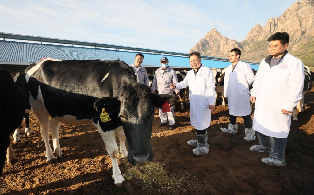 马增军教授(中)到牧场指导奶牛养殖技术
