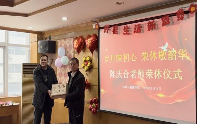 2026年1月18日,体育与健康学院举行退休教师荣休仪式,向深耕杏坛数十载并为教育事业作出突出贡献的陈庆合教授致以崇高敬意。学院党委书记张旭尧主持会议,院长杨洪涛发表致辞并为陈庆合教授赠送纪念品。校离退办、马克思主义学院、职业教育学院主要领导及学院党政领导班子成员、教师代表参加了此次荣休仪式。