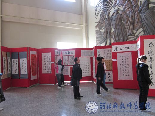 2010年10月13日至21日,我校“庆国庆”师生书法展在秦皇岛校区逸夫楼一楼大厅展出。书法展由党委学工部、团委主办,墨缘书法社承办。 本次书法展共计展出了我校师生创作的四十余幅书法作品,包括欧楷、颜楷、隶书、行书、草书等,作品题材主要围绕讴歌新中国成立六十一周年来取得的伟大成就,彰显了中国传统书法艺术的独特魅力,弘扬了中华民族的传统文化。一幅幅精美的作品连日来吸引了众多师生驻足观看。