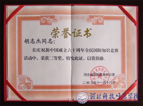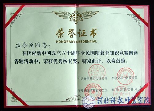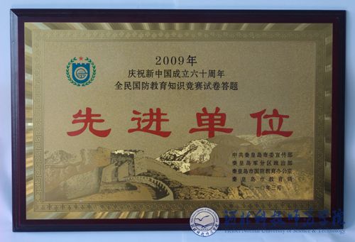 2010年3月26日上午,秦皇岛市国防教育工作会议在市军分区召开。会上,我校荣获秦皇岛市“2009年庆祝新中国成立60周年全民国防教育知识竞赛试卷答题先进单位”和“全民国防教育工作先进单位”荣誉称号。孟令臣副校长荣获“全民国防教育知识竞赛网络答题优秀校长奖”,保卫处处长、武装部长胡志杰同志荣获“庆祝新中国成立六十周年全民国防教育知识竞赛”二等奖;汪芸、张玉娟同志分别被评为“全民国防教育知识竞赛试卷答题先进个人”和“全民国防教育知识竞赛网络答题先进个人”。同时,我校“突出课堂教学,采取多种形式把国防教育融入学校生活”经验材料在会上作了书面交流。