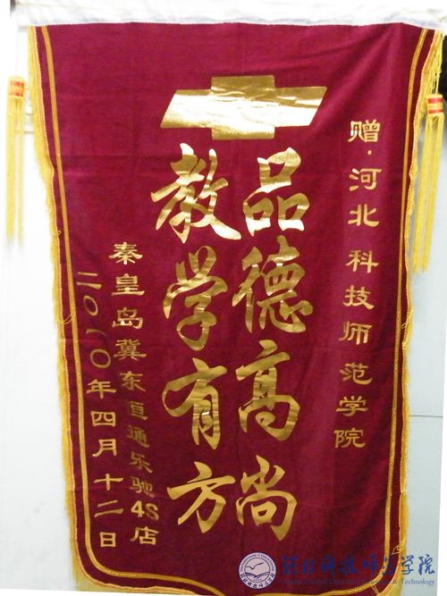 2010年4月8日晚8时许,我校开发区校区两名同学在返校途中捡到一个钱包,里面有银行卡若干张和现金三百余元,两名同学果断决定将钱包送至校学生会办公室。次日,两名同学经过核对确认后将钱包归还秦皇岛市冀东恒通乐驰4S店的失主。 4月12日上午,失主来到我校开发区校区,向我校赠送了“品德高尚,教学有方”锦旗,并再次向两位拾金不昧的同学表达感激之情。