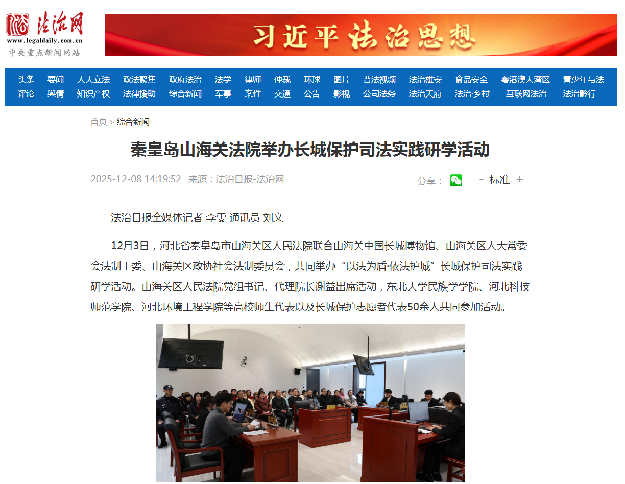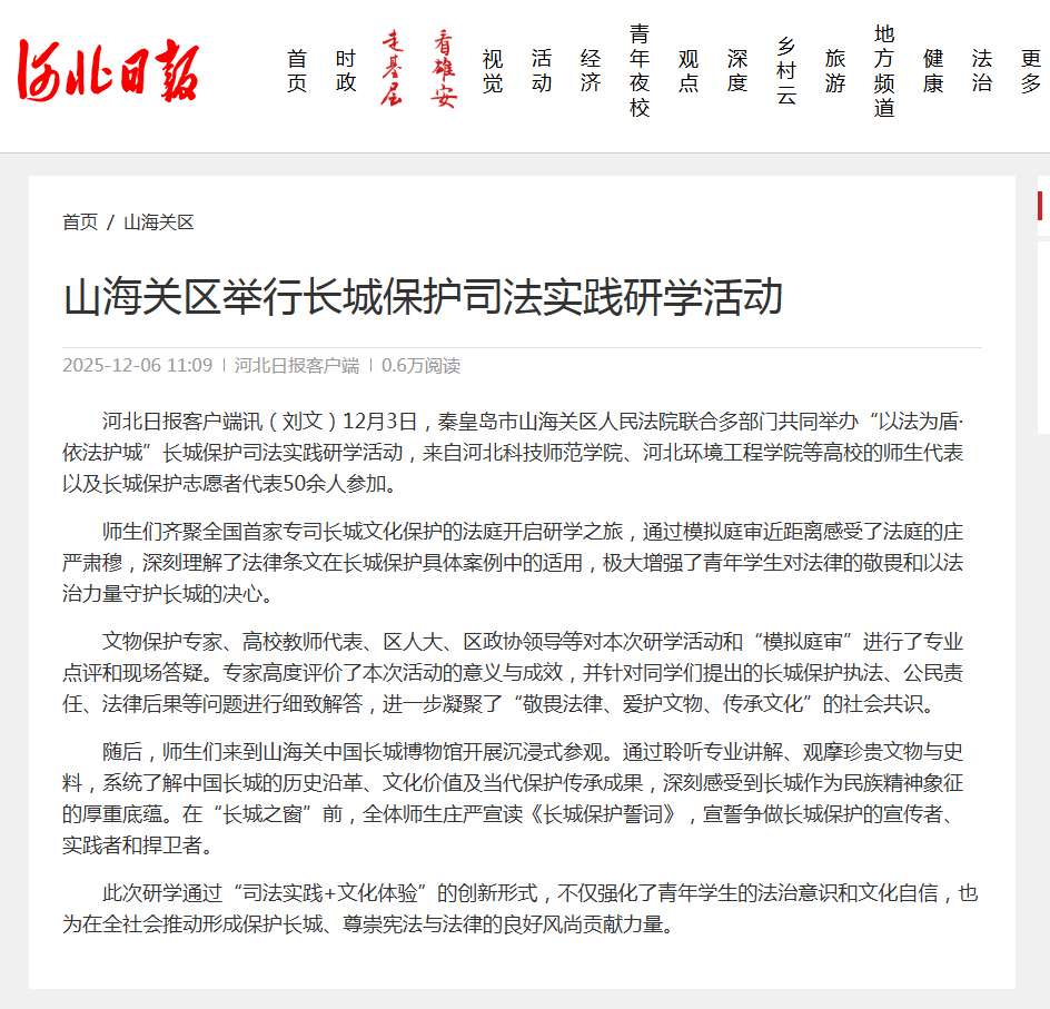 2025年12月3日,在第十二个“国家宪法日”到来之际,为深入贯彻习近平法治思想,推动宪法精神深入人心,山海关区人民法院联合山海关中国长城博物馆、山海关区人大常委会法制工委、山海关区政协社会法制委员会,共同举办“以法为盾·依法护城”长城保护司法实践研学活动。山海关区人民法院党组书记、代理院长谢益出席活动,东北大学民族学学院、河北科技师范学院、河北环境工程学院等高校师生代表以及长城保护志愿者代表50余人共同参加活动。法制网、河北日报客户端等媒体对活动进行了广泛宣传报道。